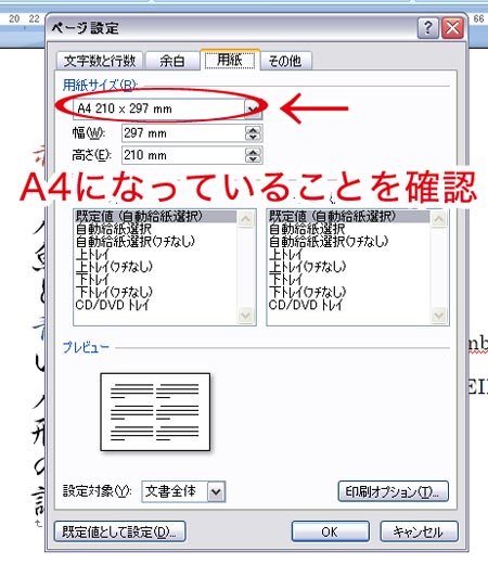 ページ設定(1):「用紙」タブでA4を選択。