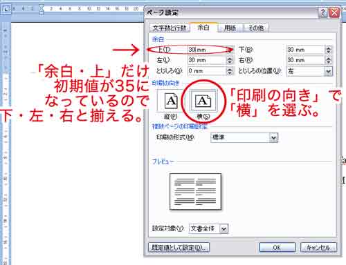 ページ設定(3):「余白」タブで「余白」の数値を上下左右同じにして、