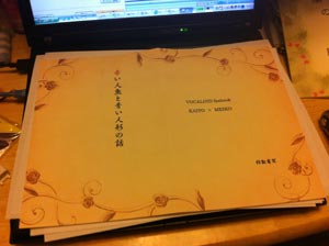 表紙用の柄入りの紙と重ねて、透かし見て文字の配置具合など見てみます。
