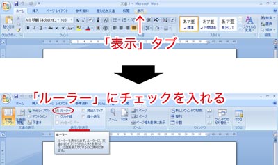 「表示」タブの「表示/非表示」から「ルーラー」にチェックを入れます。