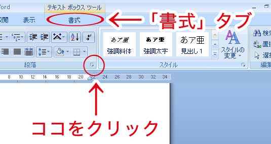 ②全選択された状態で「書式」タブから「段落」ウィンドウを開いてください。