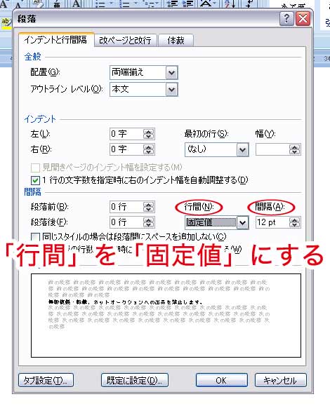 ③「インデントと行間隔」タブの「行間」を「固定値」に設定する。